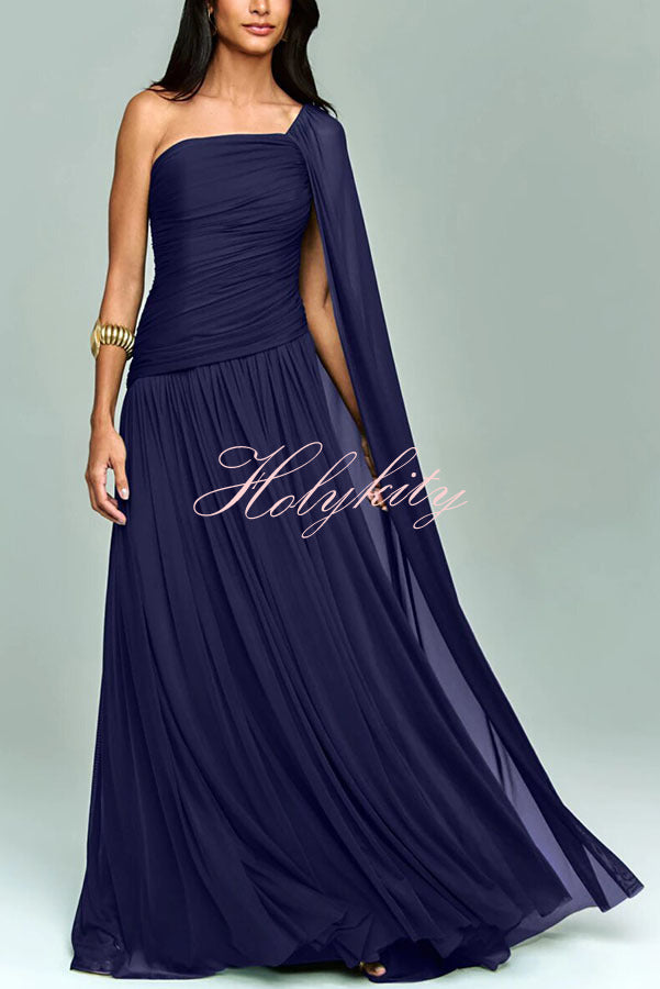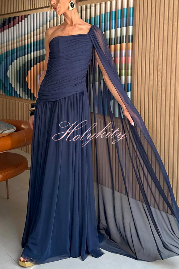 Deja Mesh Overlay Floral Print One Shoulder Ruched Stretch Maxi Dress