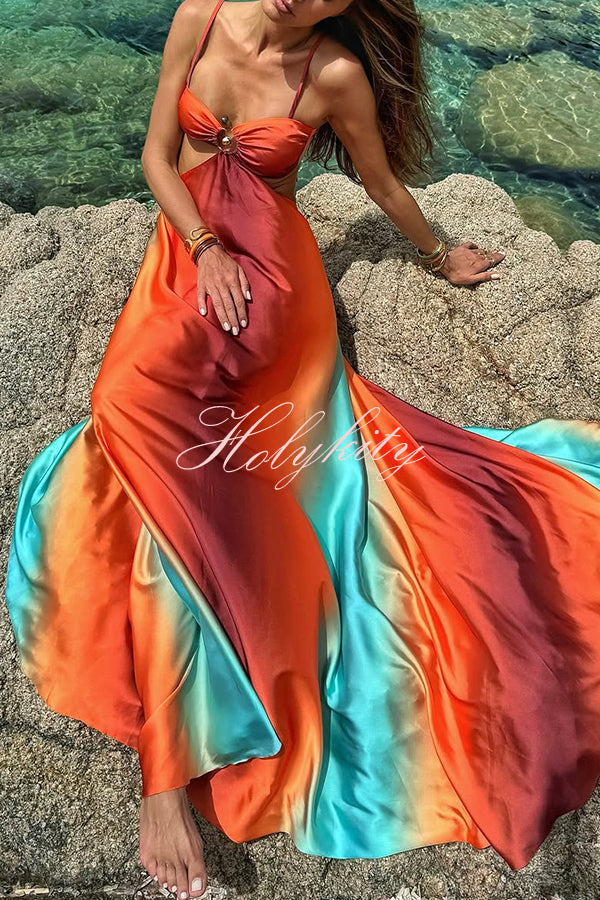 Neon Sunset Printed Metal Decoration Cutout Back Tie-up Vacation Maxi Dress