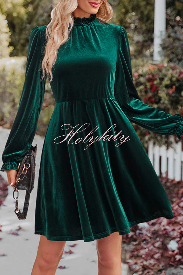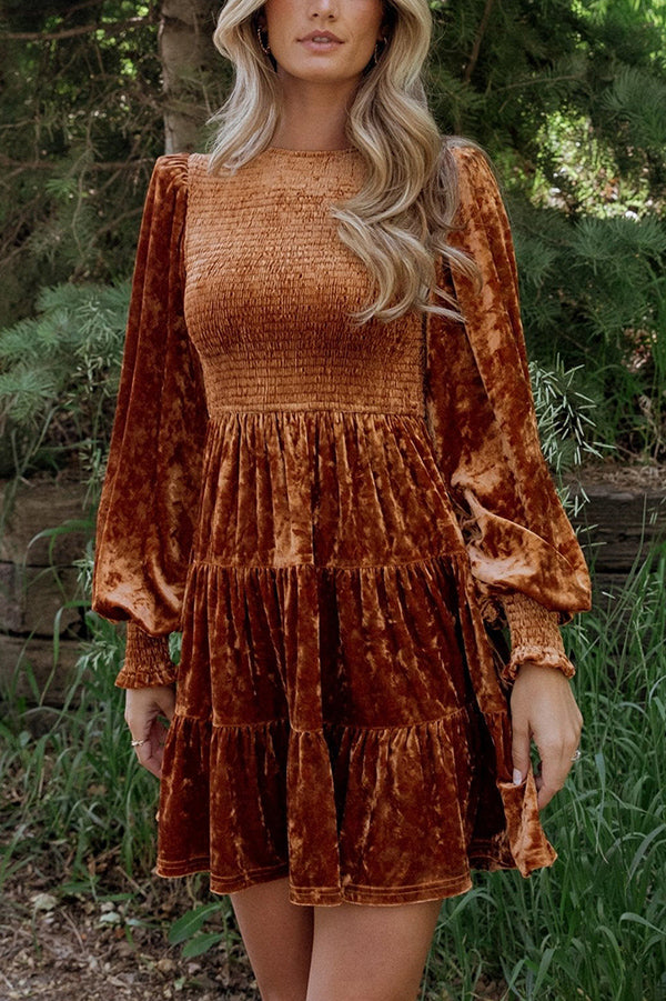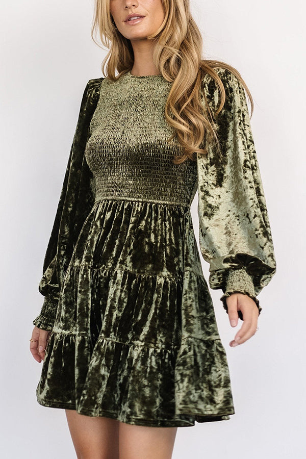 Solid Velvet Long Sleeve Crew Neck Smocked Ruffle Mini Dress