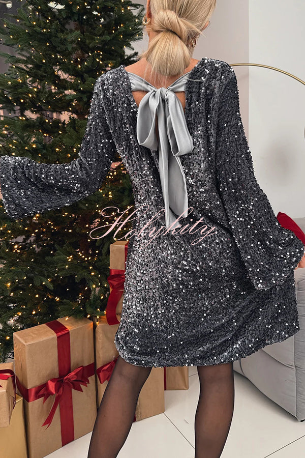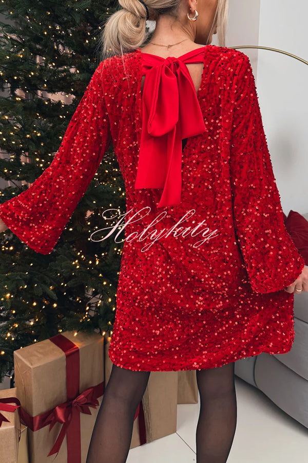 Velvet Sequin Back Bow Bell Sleeves Loose Mini Dress