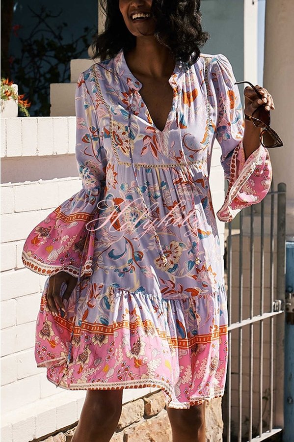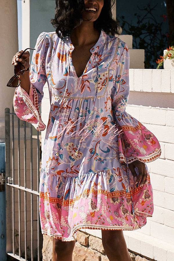 Send My Love Boho Floral Print Bell Sleeve Babydoll Mini Dress