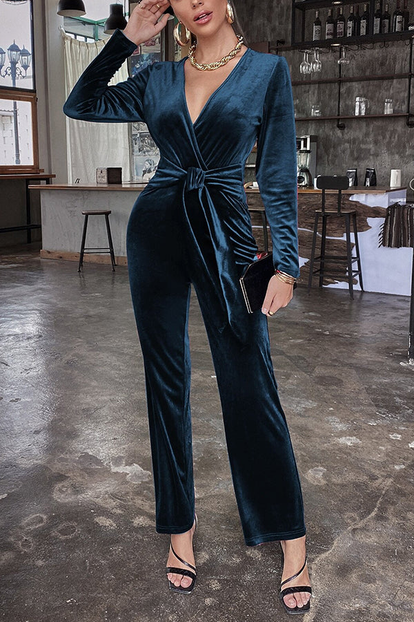 Solid Color Velvet Deep V Belt Slim Jumpsuit