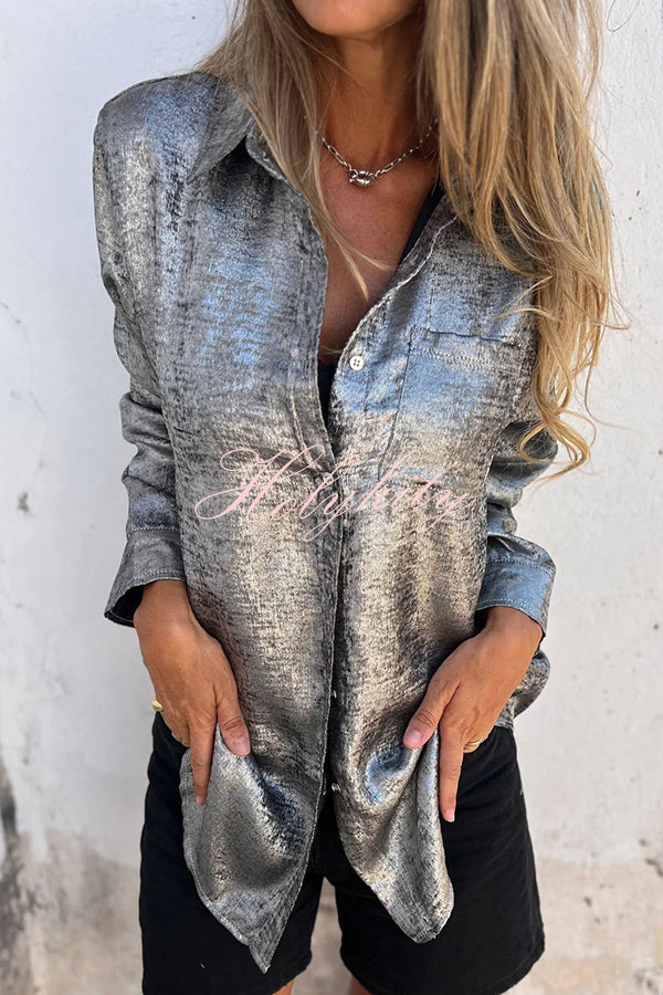 First and Fabulous Metallic Fabric Button Up Long Sleeve Loose Blouse