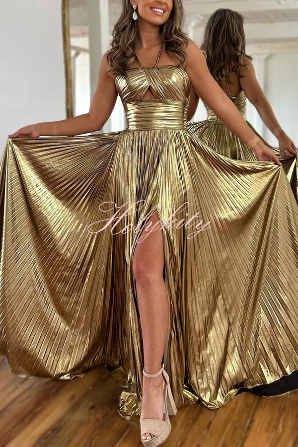 Queen Style Metallic Fabric Cross Neck Cutout Slit Pleated Maxi Dress