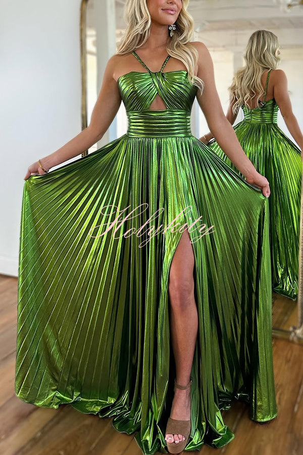 Metallic Halterneck Backless Pleated Waisted High-slit Maxi Dress