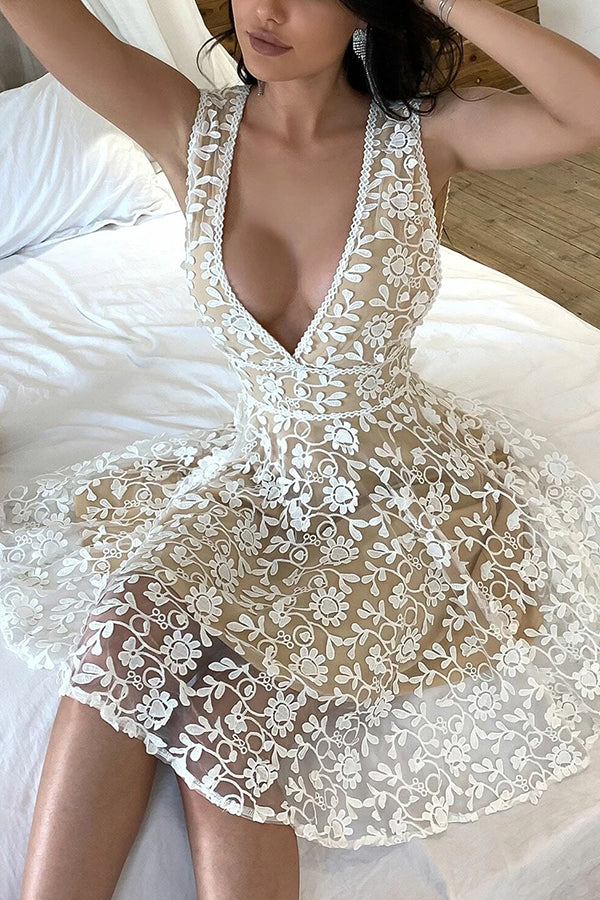 Solid Color Hollow Embroidery Casual Lace V-Neck Mini Dress