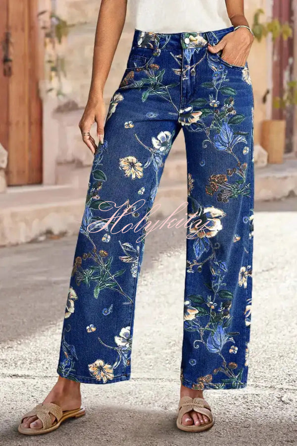 Floral Print Loose Pocket High-waisted Wide-leg Jeans