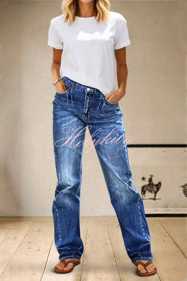Retro-style Loose Heart-shaped Back Pockets Wide-leg Jeans