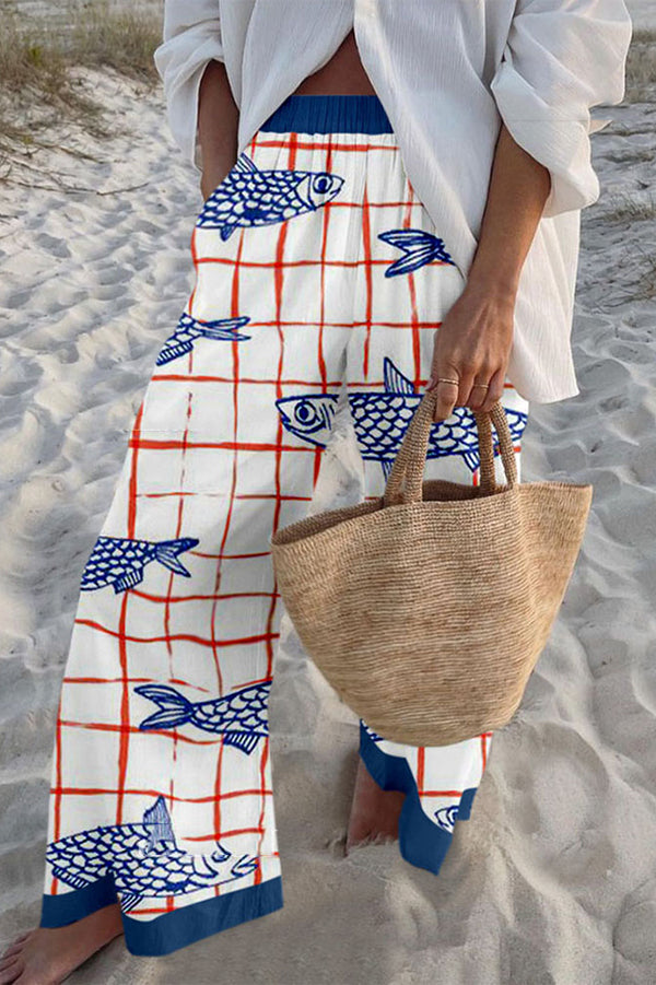 Check Fish Print Elastic Waist Loose Pocket Pants