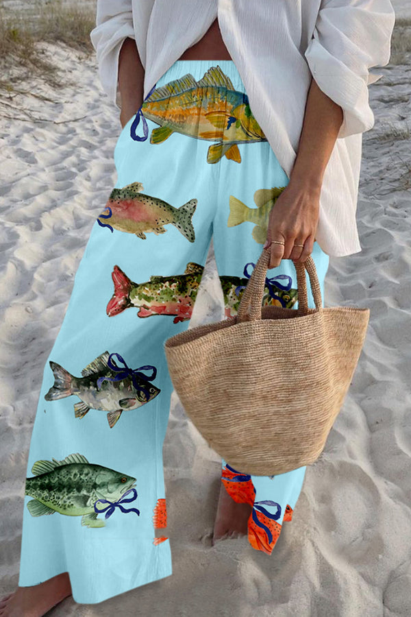 Bowknot Fish Print Elastic Waist Loose Pocket Pants