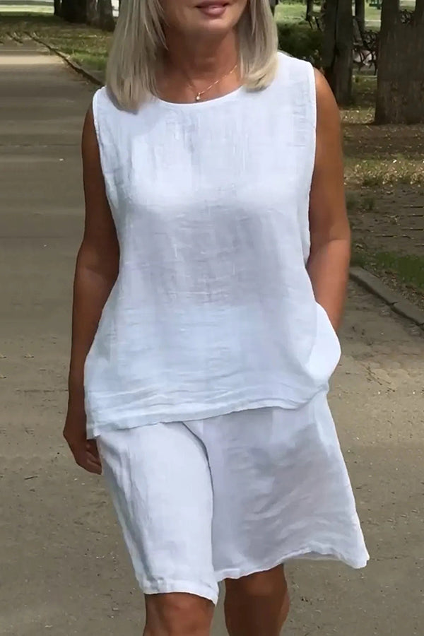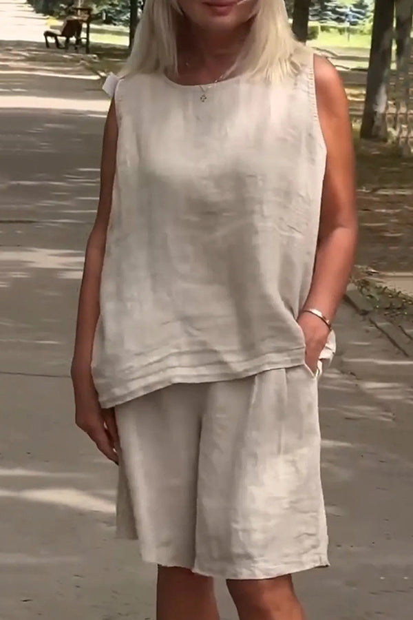 Linen Blend Solid Sleeveless Crewneck Top and Loose Pocket Shorts Set