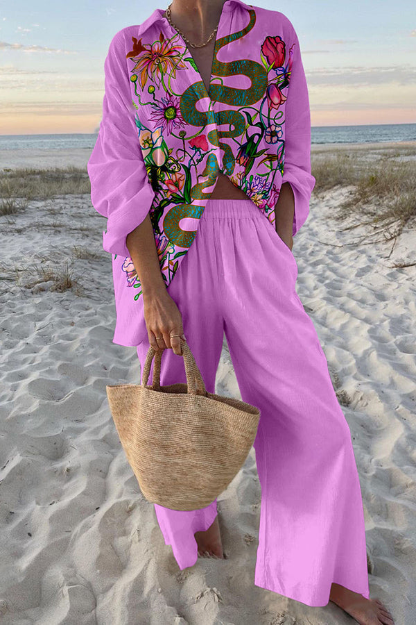 Plant Snake Print Oversized Shirt and Elastic Waist Pocket Pants Set