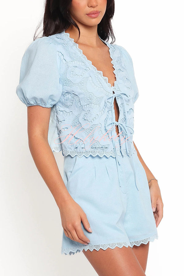 Fashionable V-neck Tie Puff Sleeve Top and Casual Pocket Shorts Set