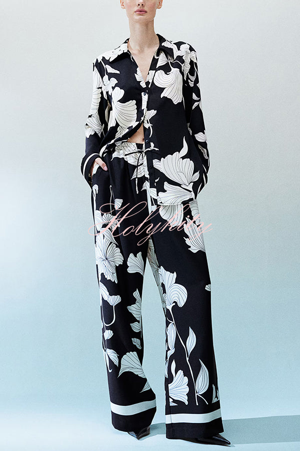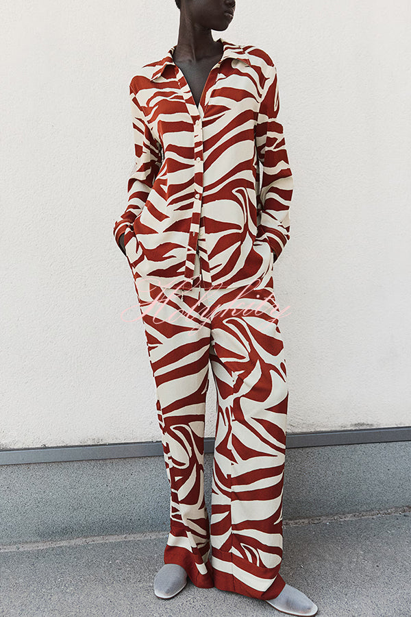 Unique Print Lapel Long Sleeve Loose Shirt and Elastic Waist Casual Pocket Wide Leg Pants Set