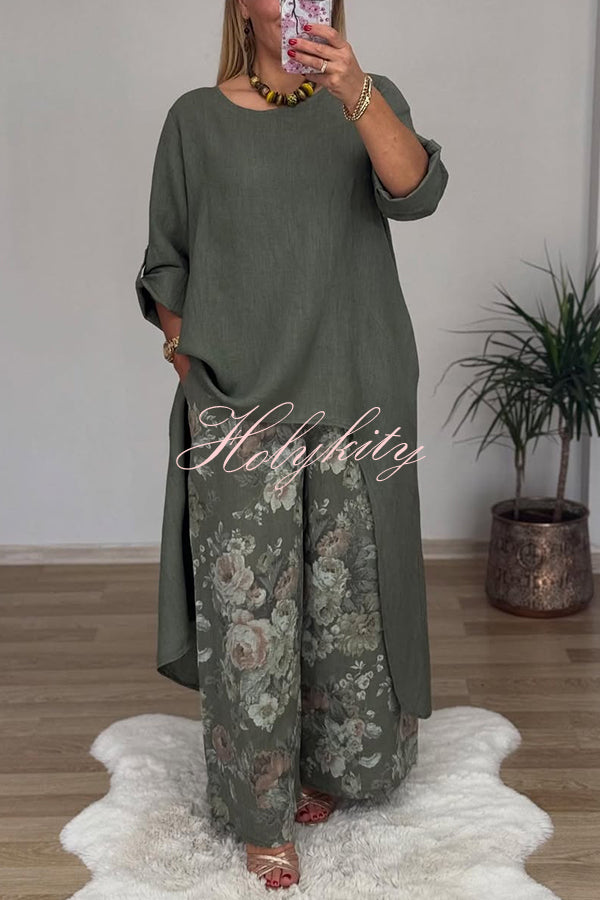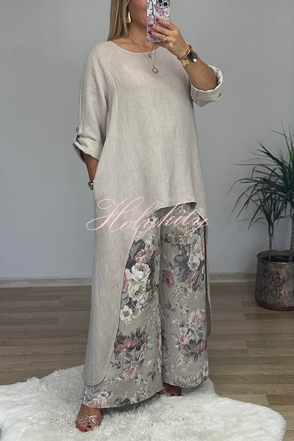 Linen Blend Crew Neck Long Sleeve Irregular Loose Top and Elastic Waist Floral Print Casual Pocket Set