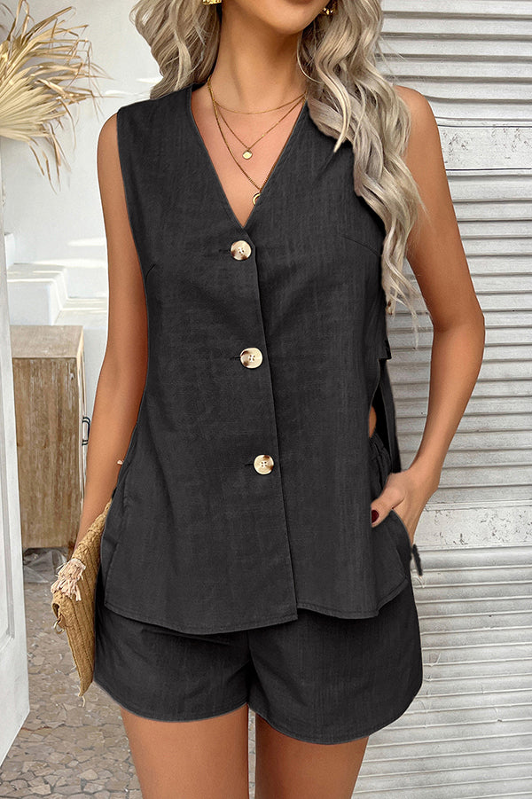 Solid Color Holiday Style V-neck Button Vest and Elastic Waist Casual Pocket Shorts Set