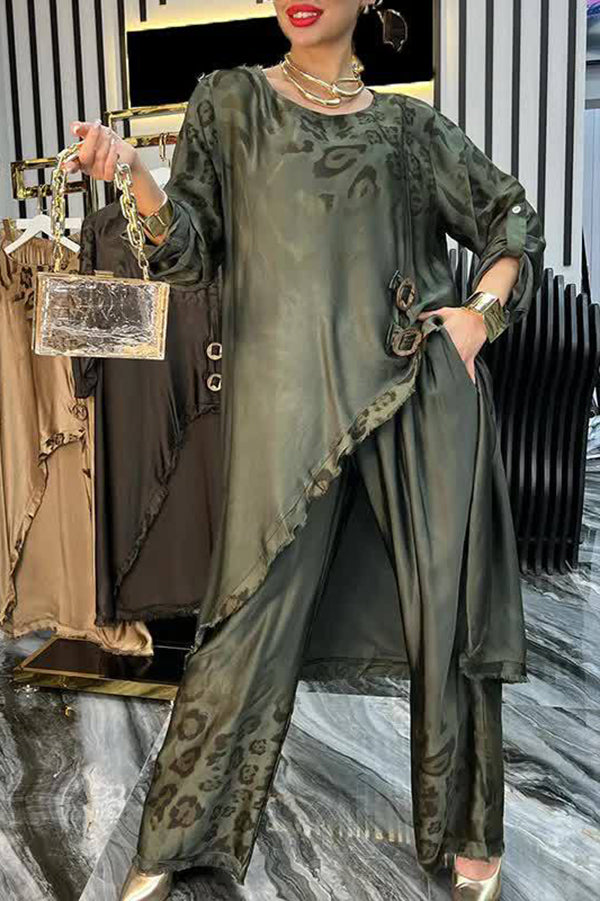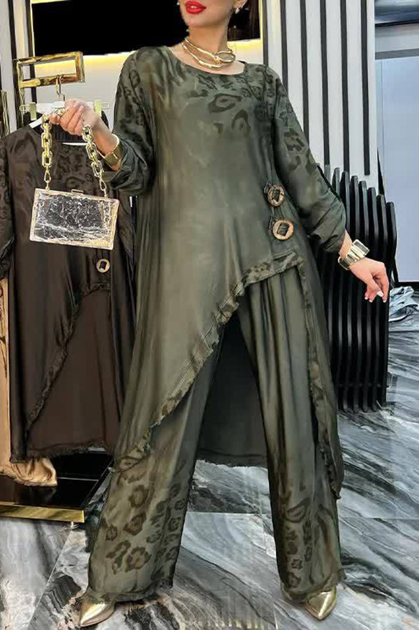 Leopard Print Button-decorated Round Neck Long-sleeved Irregular Casual Top and Elastic Waist Loose Pocket Pants Set