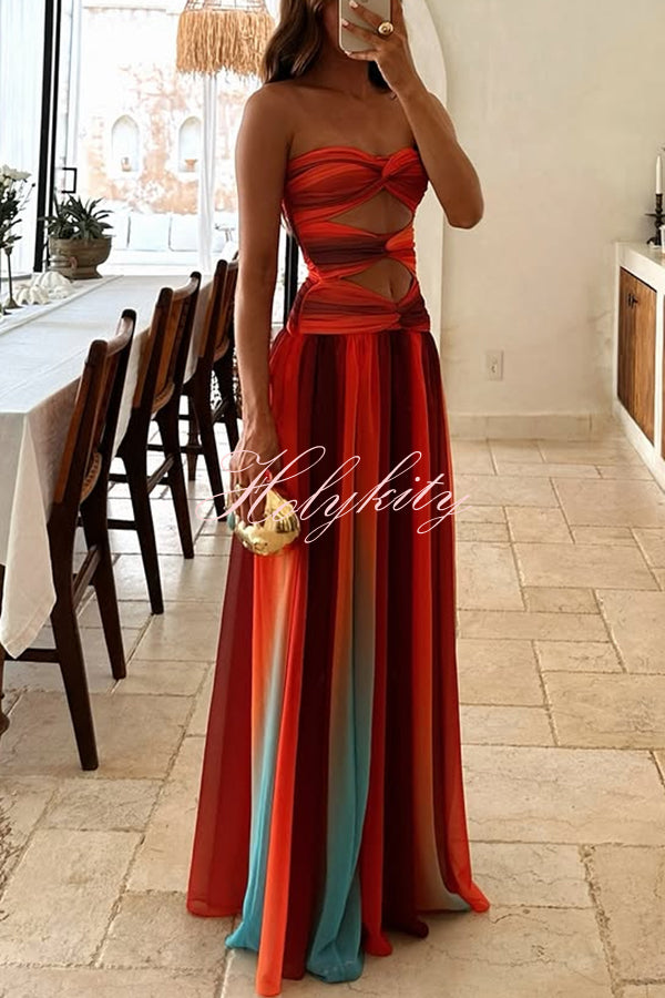 - This dress is a stunning piece that blends elegance and energy with its carefully designed pleated details. The sleek design features a long flowing skirt and the print transitions between warm tones of orange and terracotta, mixed with cooler tones of turquoise blue. Side zip closure. This gradient color is reminiscent of a Sardinian sunset and creates a sophisticated yet natural atmosphere. It's the ideal venue for special events that will leave a lasting impression and be unforgettable.