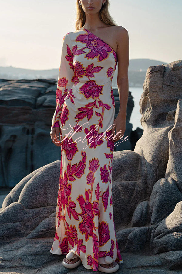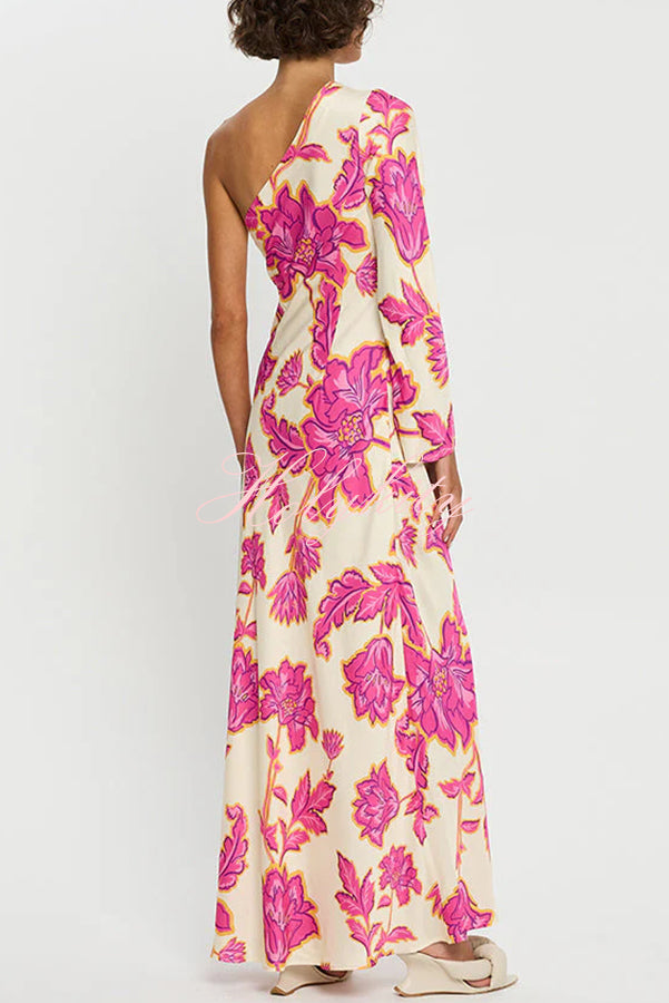 - Rhia is hand painted vibrant pink florals, with a tangerine outline on a soft cream base. The Rhia One Sleeve Maxi Dress is a bias cut featuring an asymmetrical neckline complete with a subtle flared hem .
