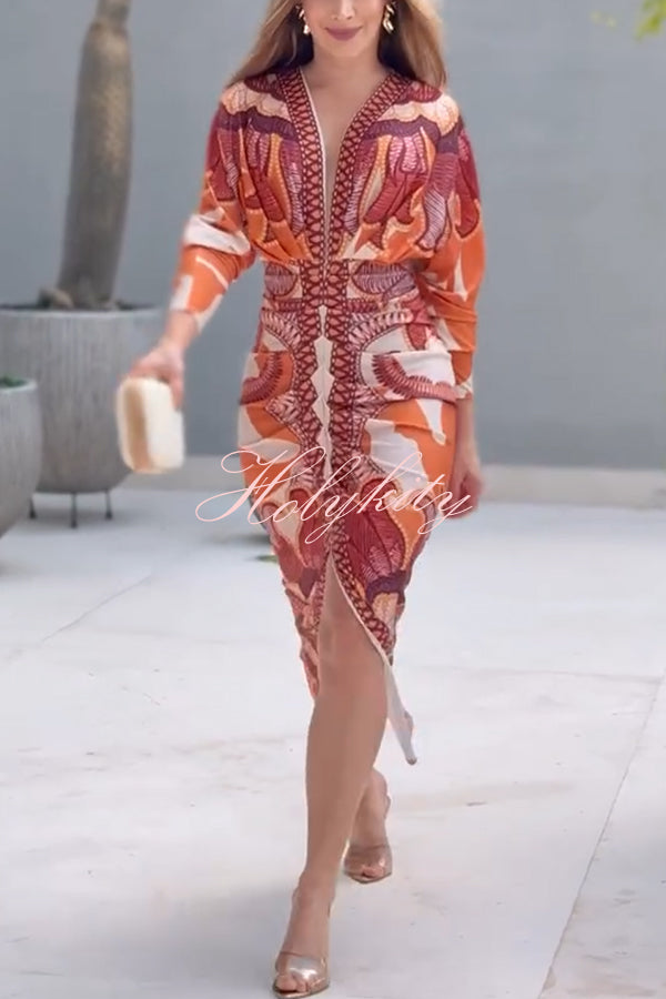 Brazilian Style Unique Print Dolman Long Sleeve Ruched Slit Midi Dress