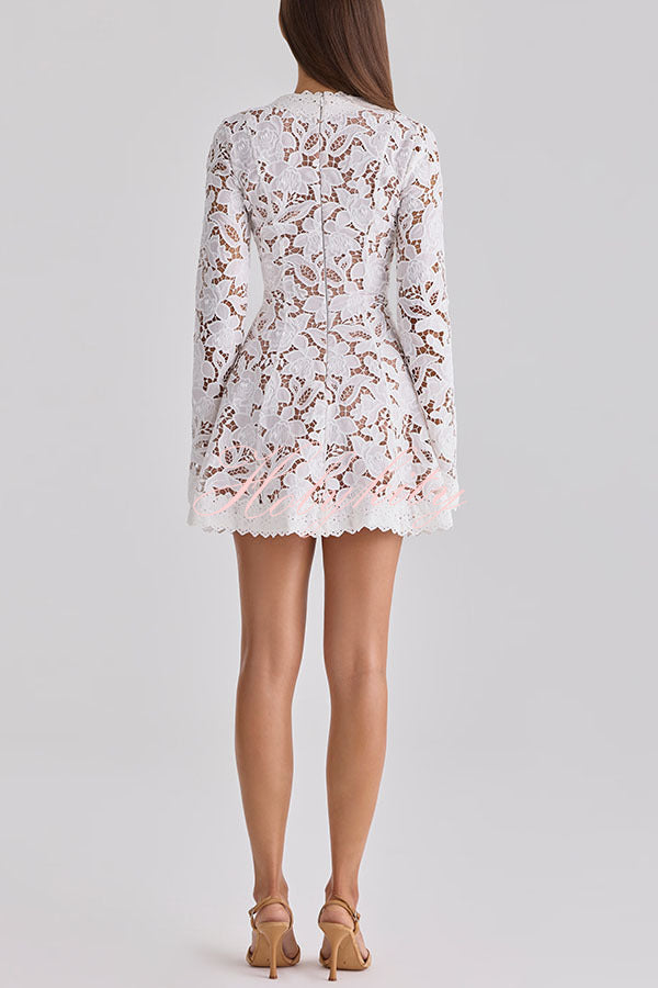 - The most beautiful lace dress. The "Bianca" features luxurious lace detailing that creates an unforgettable, stunning effect. This sun-kissed dress is lined with neutral-toned viscose for a skin-like feel, while delicate lace openwork embellishes the fabric. The lace is decorated with a beautiful floral pattern and exquisite details outlined with pretty English embroidered piping. It features a soft V-neck with delicate ties, unlined long sleeves, and a sweet mini-skirt length. You can pair it with a bikini for a sunset drink or choose it as your go-to choice for a sunny city lunch.Our distinctive clothing will add instant style to your wardrobe.