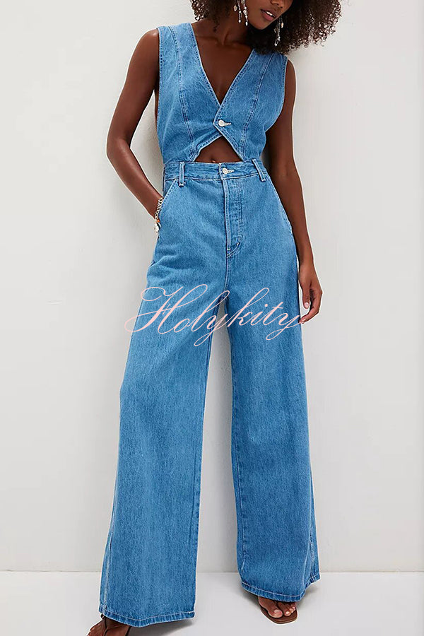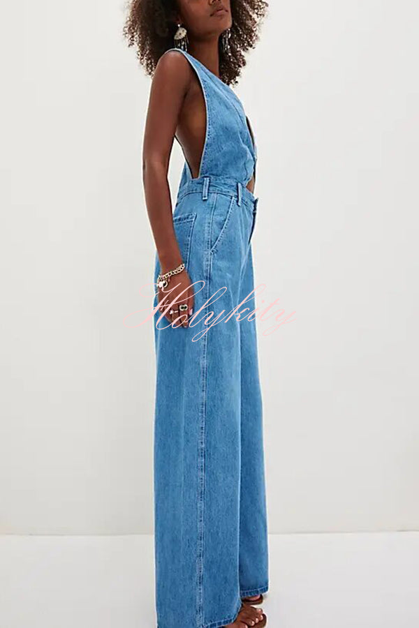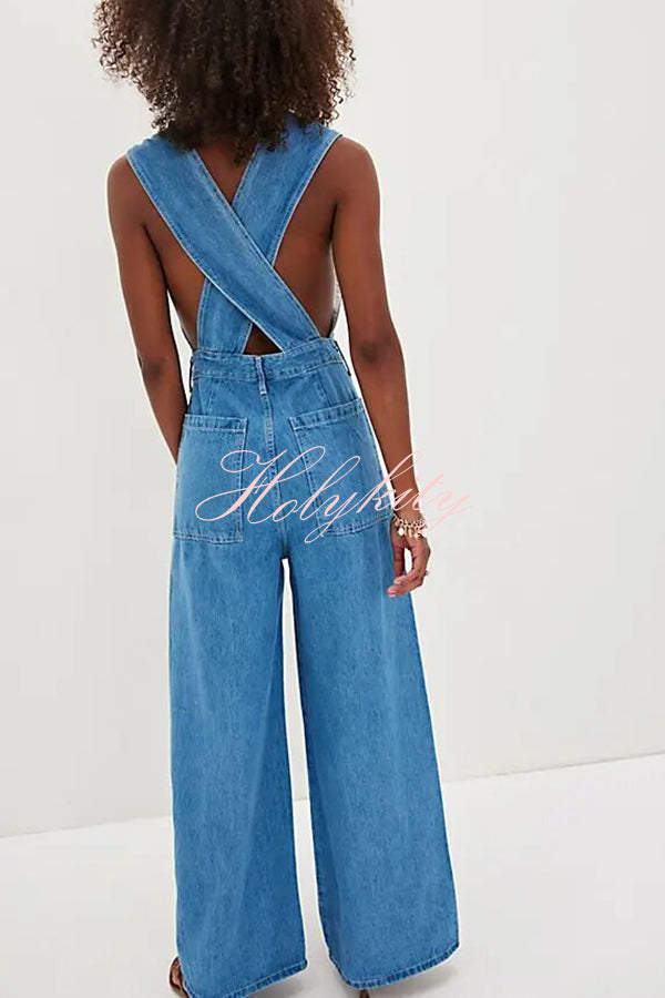 - This denim jumpsuit features a bold design, blending retro elements with a modern silhouette.The vest-style top features a cutout front, crisscross straps at the back, a zippered and button placket, and four pockets, exuding a fashionable style.Our distinctive clothing will add instant style to your wardrobe.