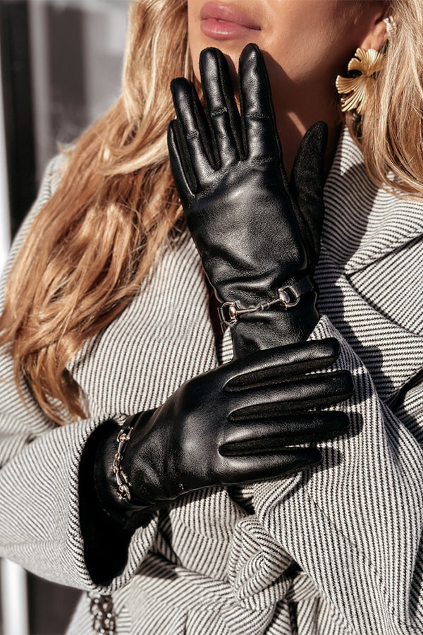 Gloves made of suede and imitation leather are the perfect winter accessory. This model features soft insulation on the interior and gold accents on the wrist. Additionally, there are special apps for your index finger and thumb that allow you to use your phone.