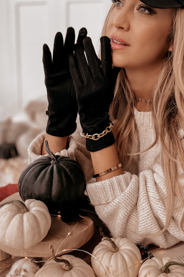Faux suede gloves with decorative chain at top. This product will be an extremely stylish addition to many winter styles. A must-have choice for outdoor activities such as driving and cycling. Two color versions are available.