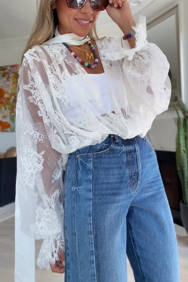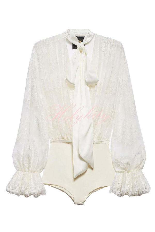- The bodice of this bodysuit is crafted from delicate lace, paired with dramatically voluminous sleeves to create an alluring, semi-sheer effect. The lower section features a contrasting solid-color panel design, while a tie-fastening bow at the neckline infuses the ensemble with a touch of refined, classical elegance. This bodysuit masterfully blends vintage elements with a modern silhouette, resulting in a versatile yet truly unforgettable fashion statement.Our distinctive clothing will add instant style to your wardrobe.
