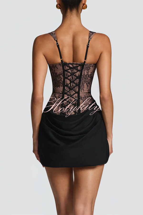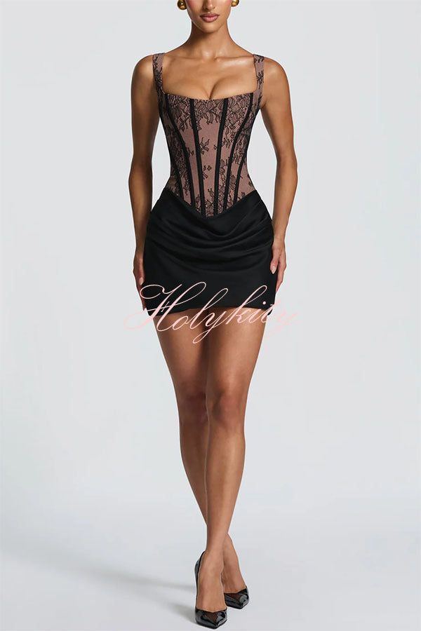 - This lace Cornelia mini dress features a floral-patterned corset design, a square neckline, a low waist, and a contrasting draped skirt with deep pleats. A back tie cinches the waist for an elegant and sophisticated silhouette.Our distinctive clothing will add instant style to your wardrobe.
