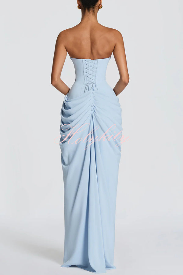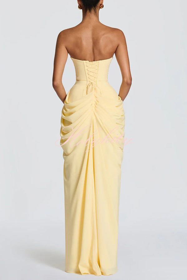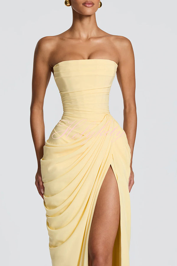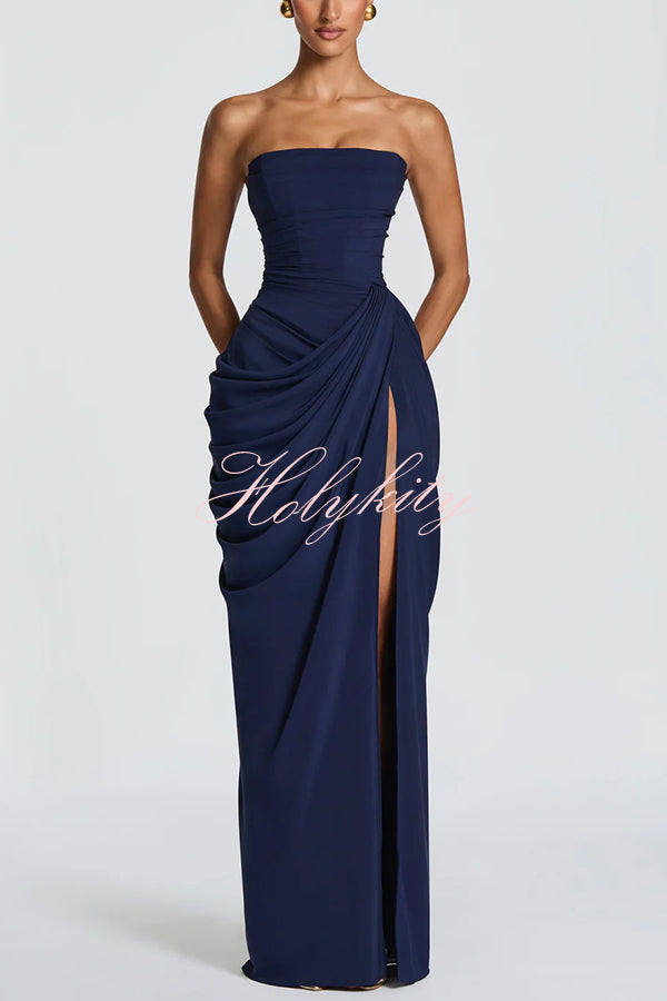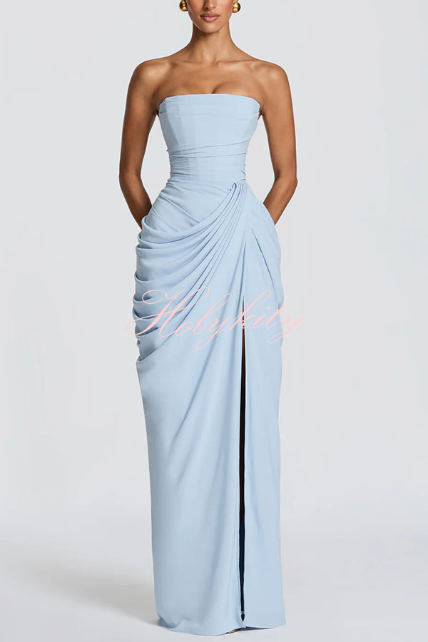 Cyra maxi dress, crafted from luxurious chiffon. The strapless neckline features directional pleats, an integrated bodice, and a back tie that accentuates the figure. An asymmetrical pleated skirt flows smoothly into a straight silhouette. A high slit adds dynamism and elegance.Our distinctive clothing will add instant style to your wardrobe. -
