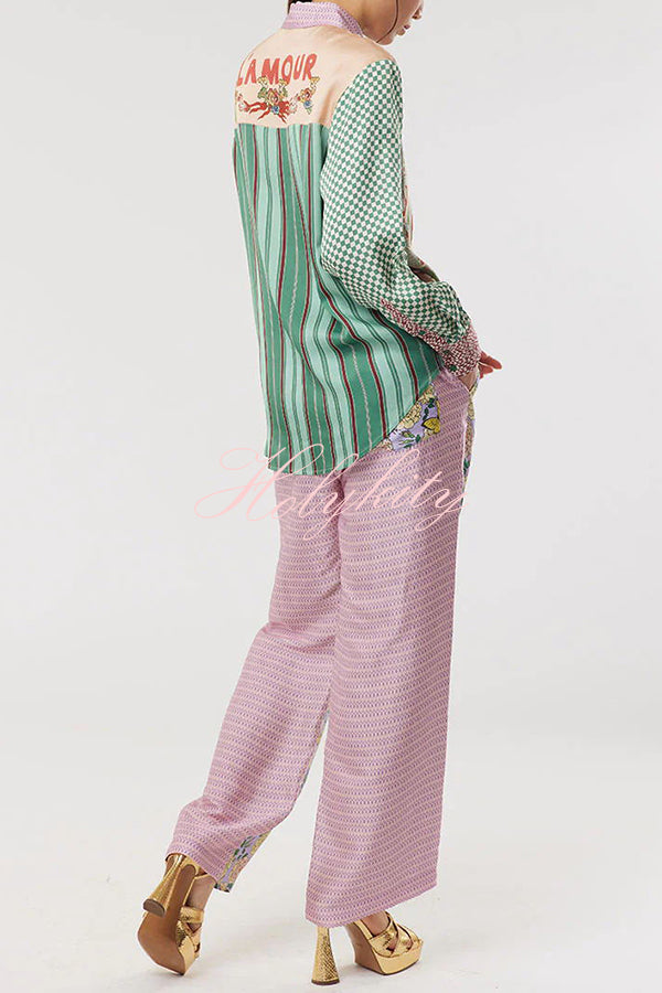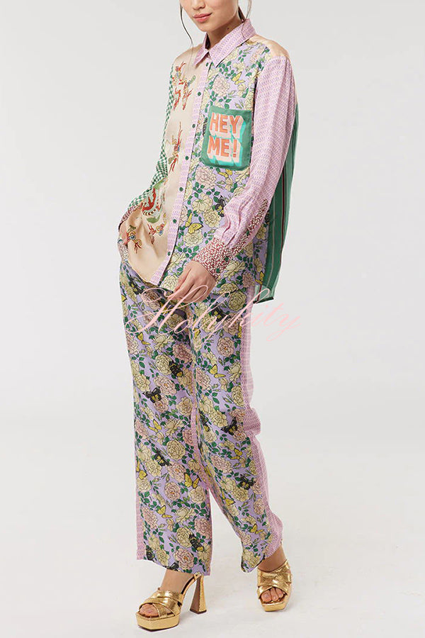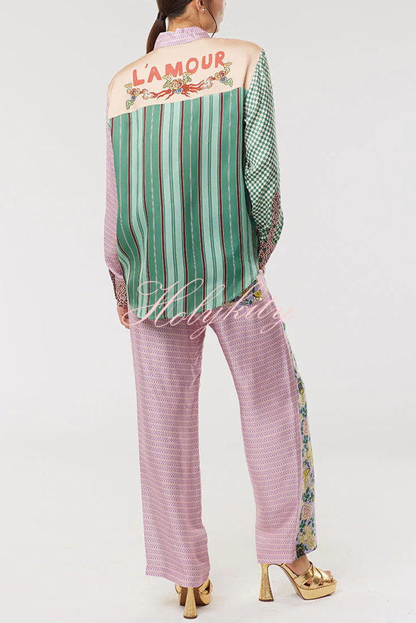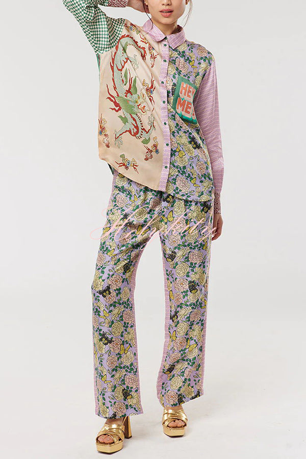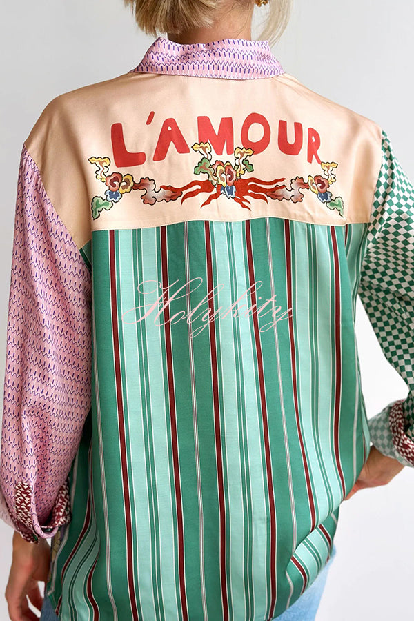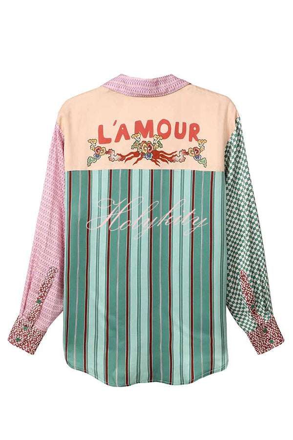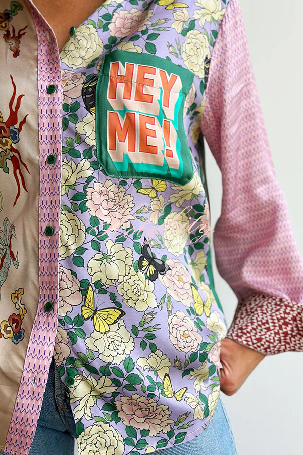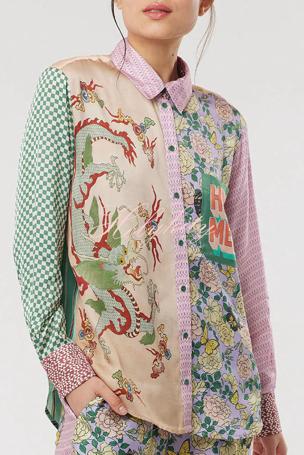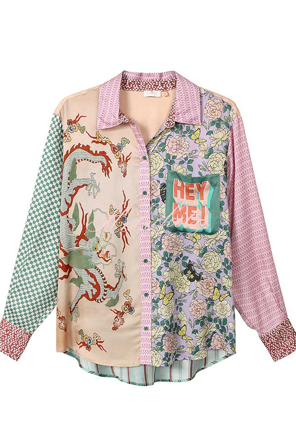 - Classic fit mixed pattern long sleeved shirt. Dragon graphic print on front along with “Hey Me!�?pocket. Back logo is L’Amour.