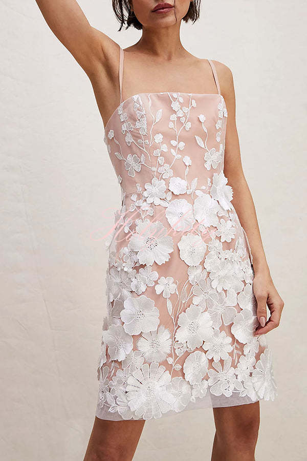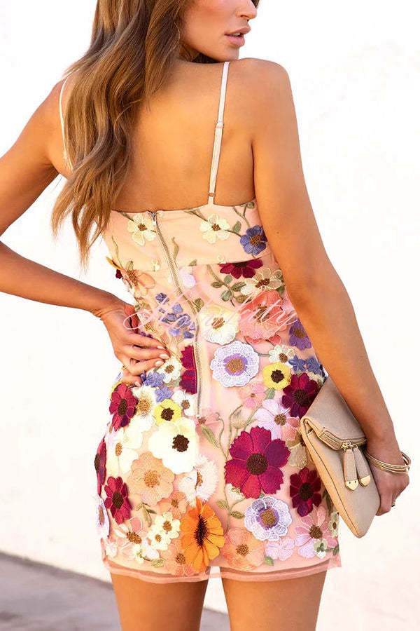- Your beauty will bloom in this gorgeous mini dress! - Fully lined mesh material with colorful 3D floral embroidery - A straight neckline - Adjustable spaghetti straps - Back zip closure - A figure flattering silhouette that ends in a straight mid-thigh length hemline.