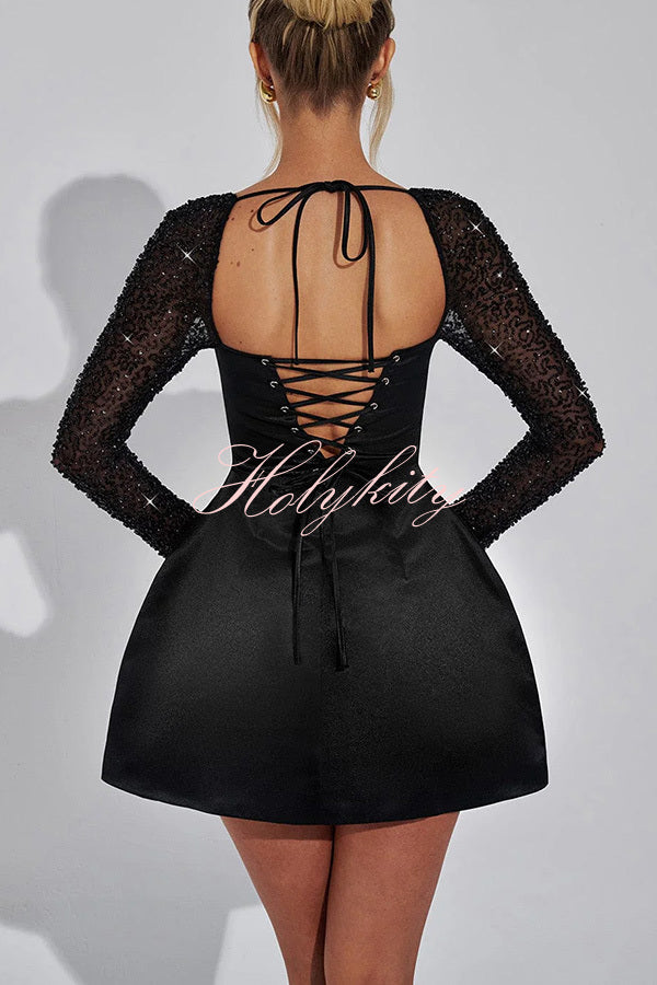 - our new favourite mini made with a satin body and stretch mesh long sleeves which are embellished with beads. This ultra cute design cinches you at the waist and flares into a playful bubble shape skirt, finished with a lace up back for your perfect fit.