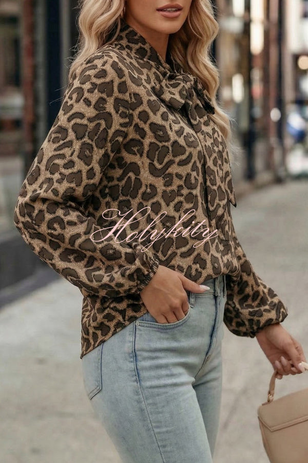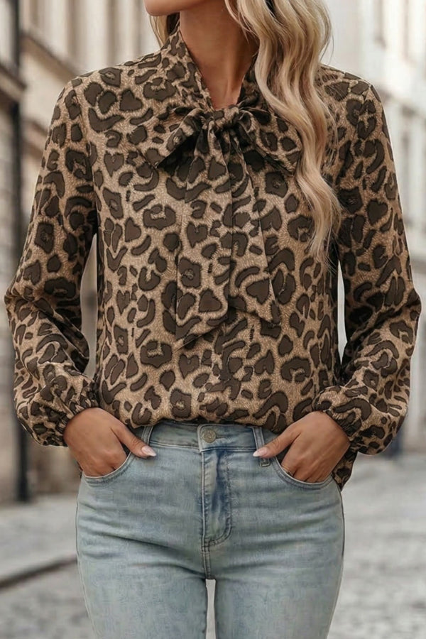 Leopard Print Bow Collar Long-sleeved Loose Shirt