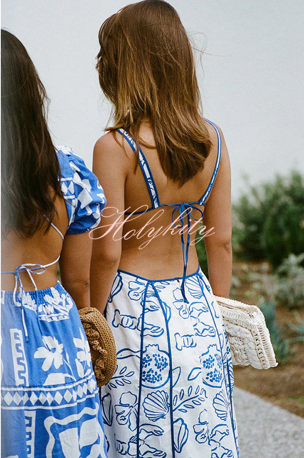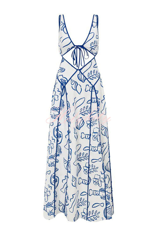 - This Dress is made from a high quality natural linen cotton blend fabric with our exclusive shoreline print. It features an open back, tie at centre bust, cutouts at. waist, contrast blue bind panels and trims throughout and a flouncy ankle grazing midi skirt. Style your look with the Strappy Heels!