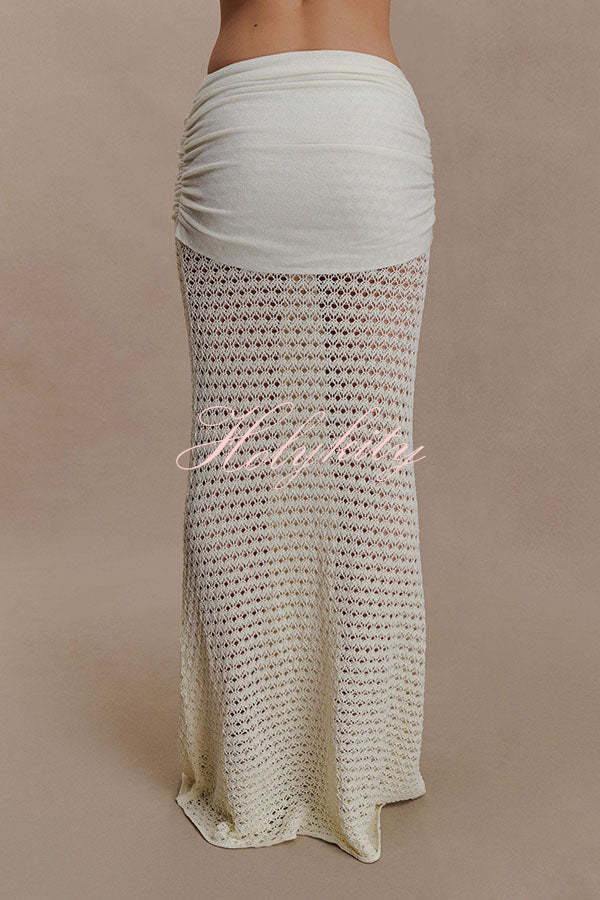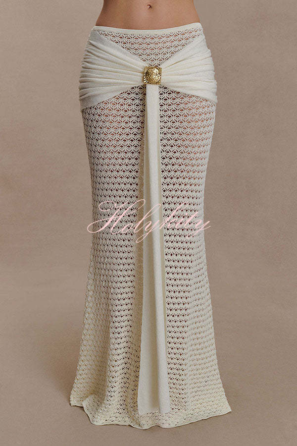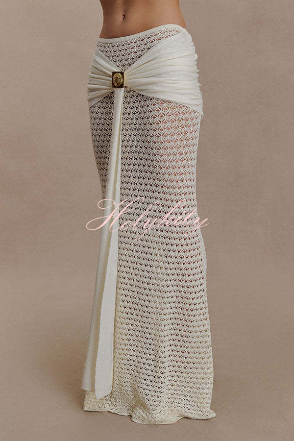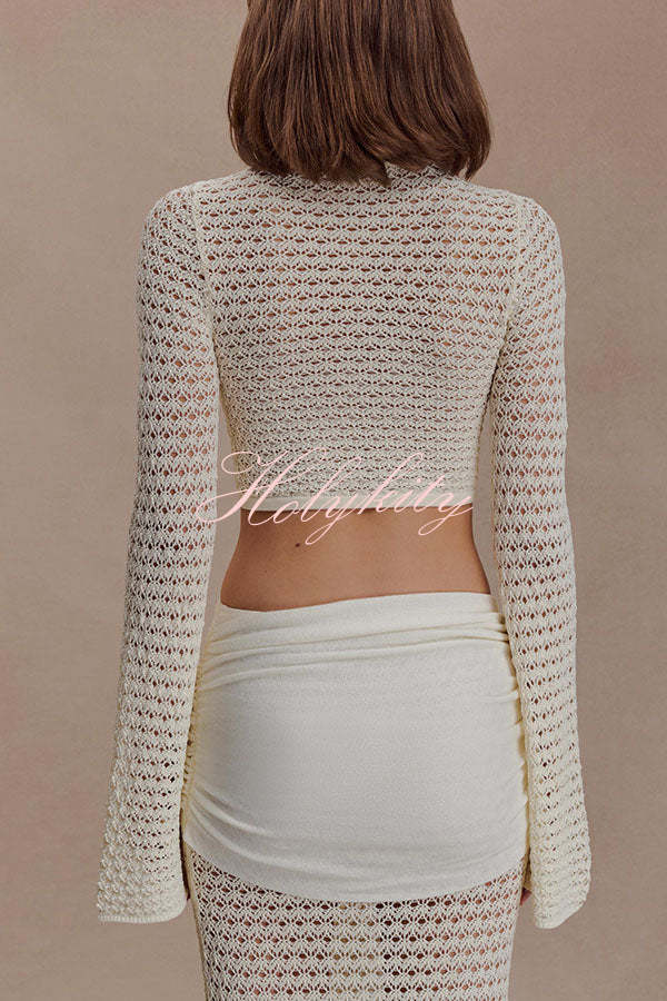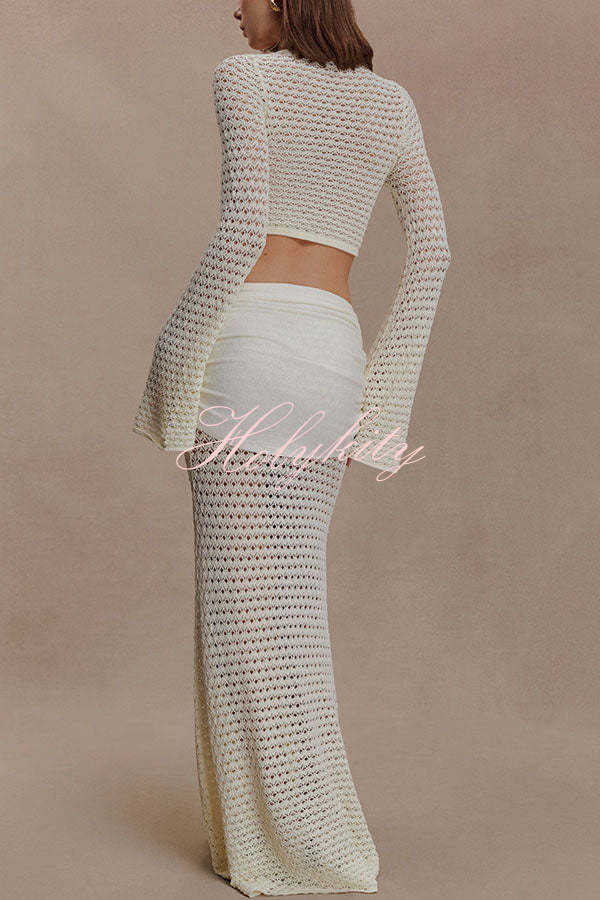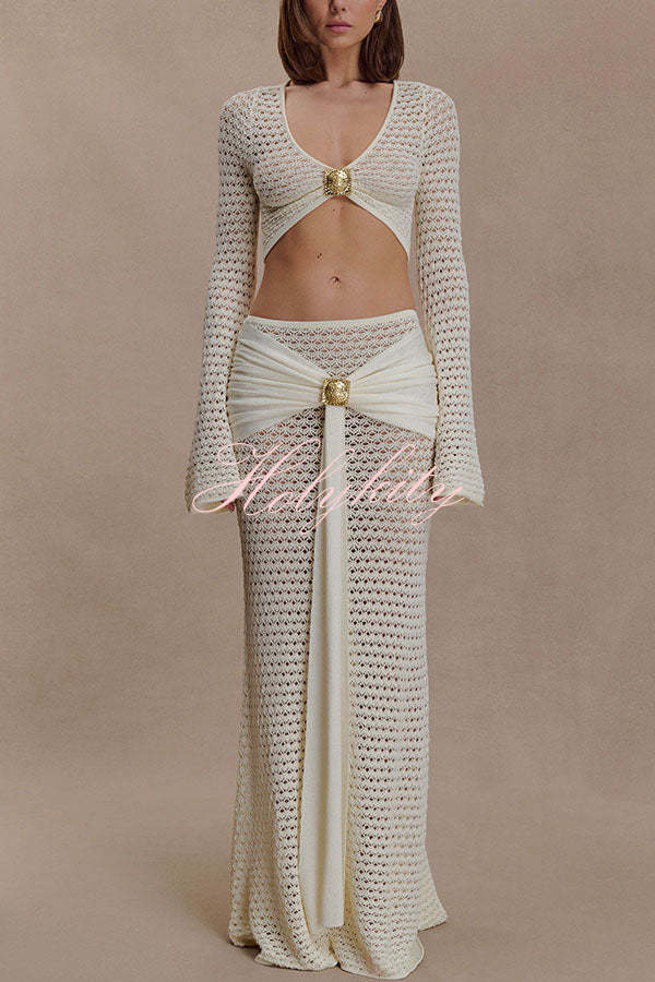 - The MANIA crocheted long-sleeved crop top features a V-neck design with delicate pleating details at the center front. The flowing long sleeves add a touch of feminine movement, complementing the cropped silhouette for an elegant look. The long skirt features a mid-rise elastic waistband, balancing comfort with a flattering, elongated silhouette. The fabric drapes beautifully, creating a fluid hemline, and is accented with polished metal hardware for a sculptural focal point.Our distinctive clothing will add instant style to your wardrobe.
