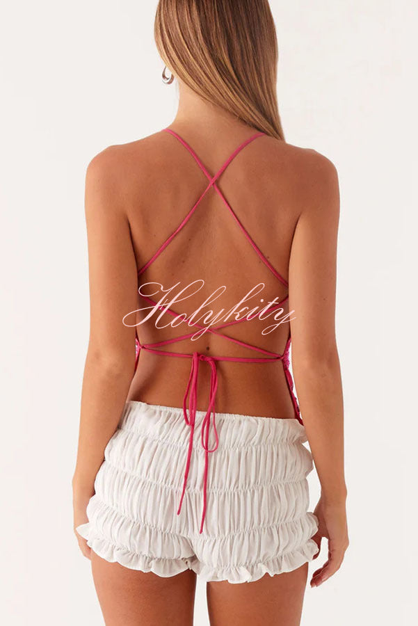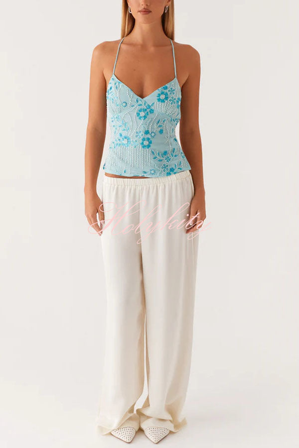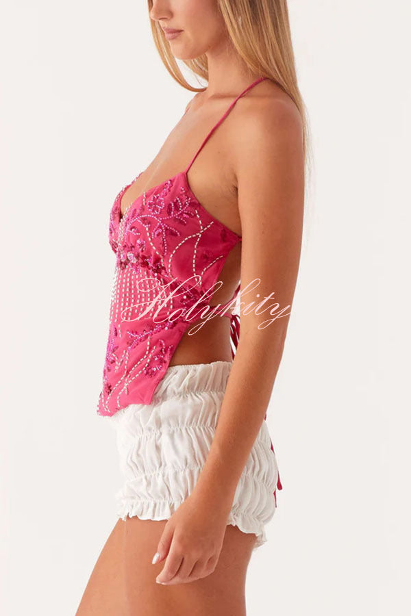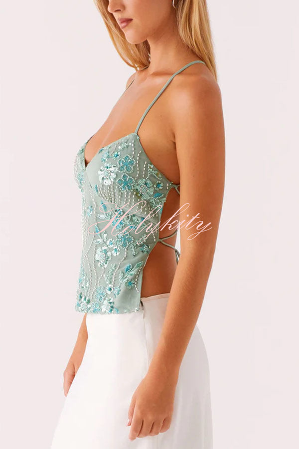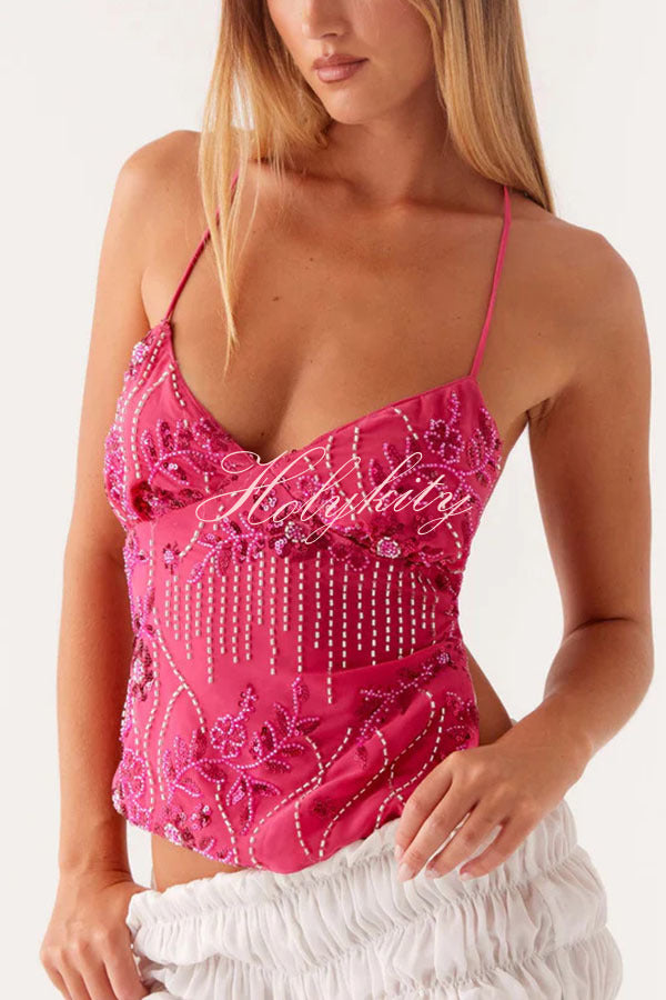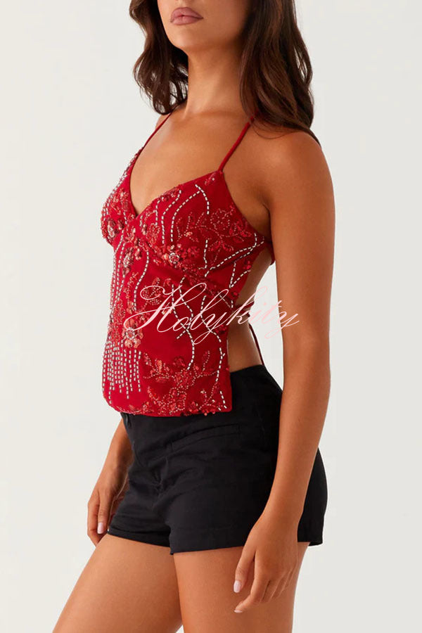 - Sequin Cami Top features a front V-neckline, dazzling beaded material, and an open back. This piece brings effortless glamour to any night, perfect for catching the light on the dance floor.Our distinctive clothing will add instant style to your wardrobe.