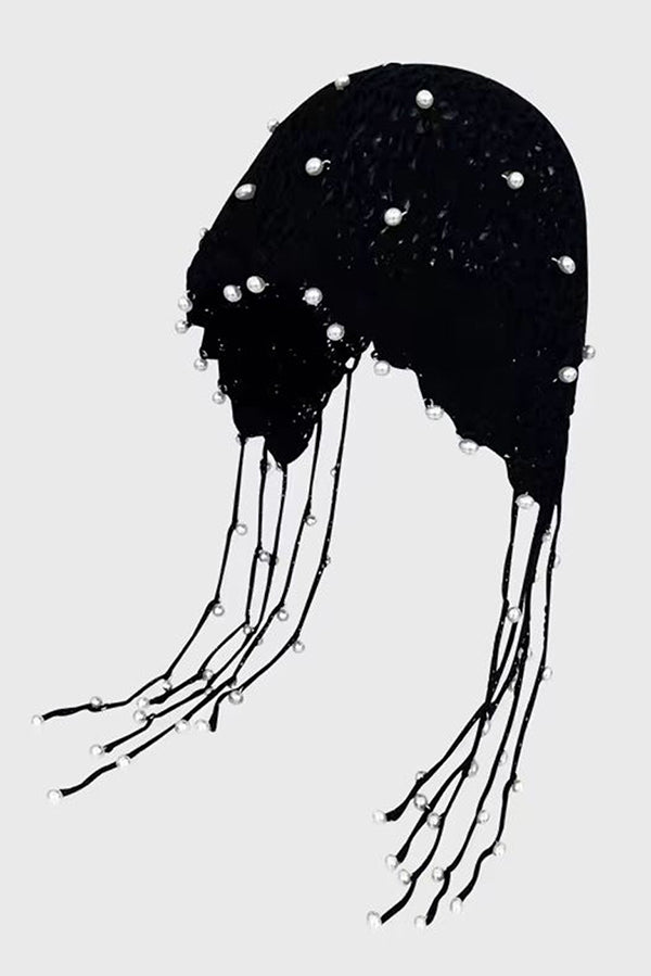 One size fits all. Knitted fringe beanie with pearl embellishment.