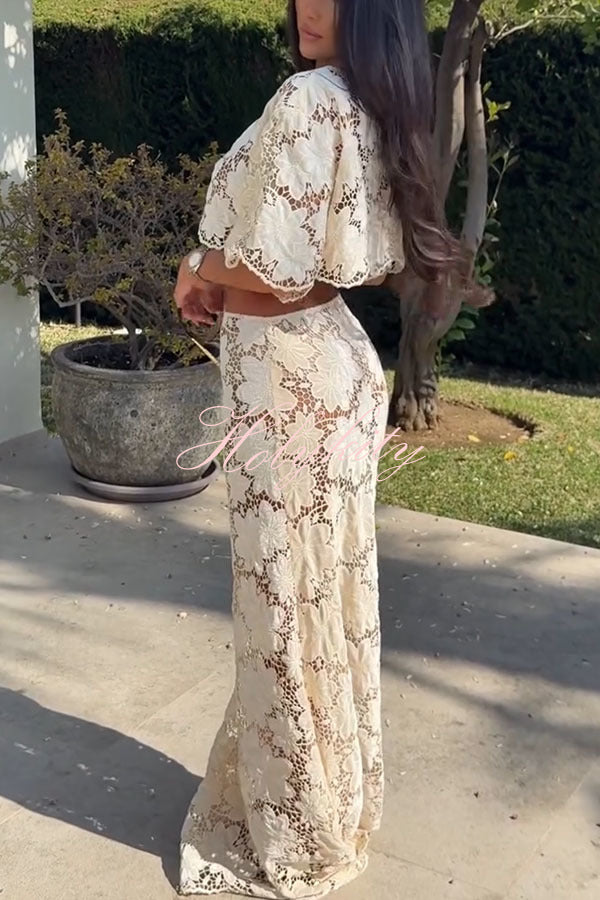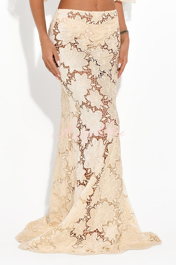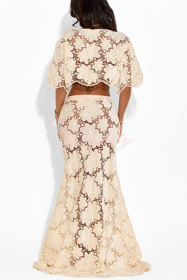 Elevate your style and become the center of attention with our beige floral lace maxi skirt suit, exuding elegance, charm, and modern glamour. Our distinctive clothing will add instant style to your wardrobe.