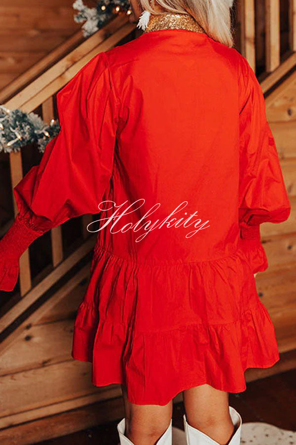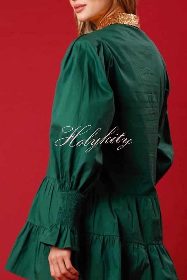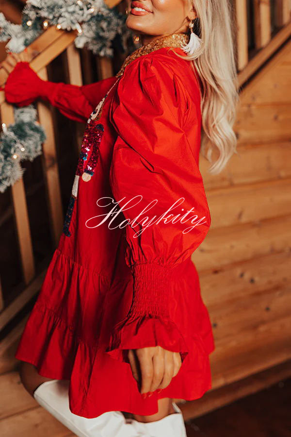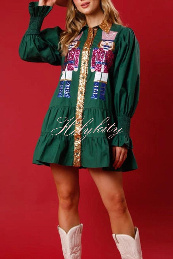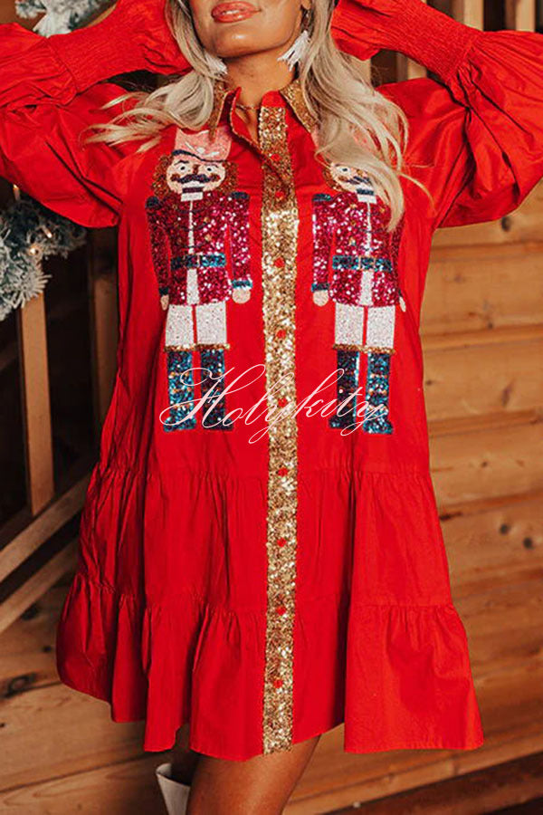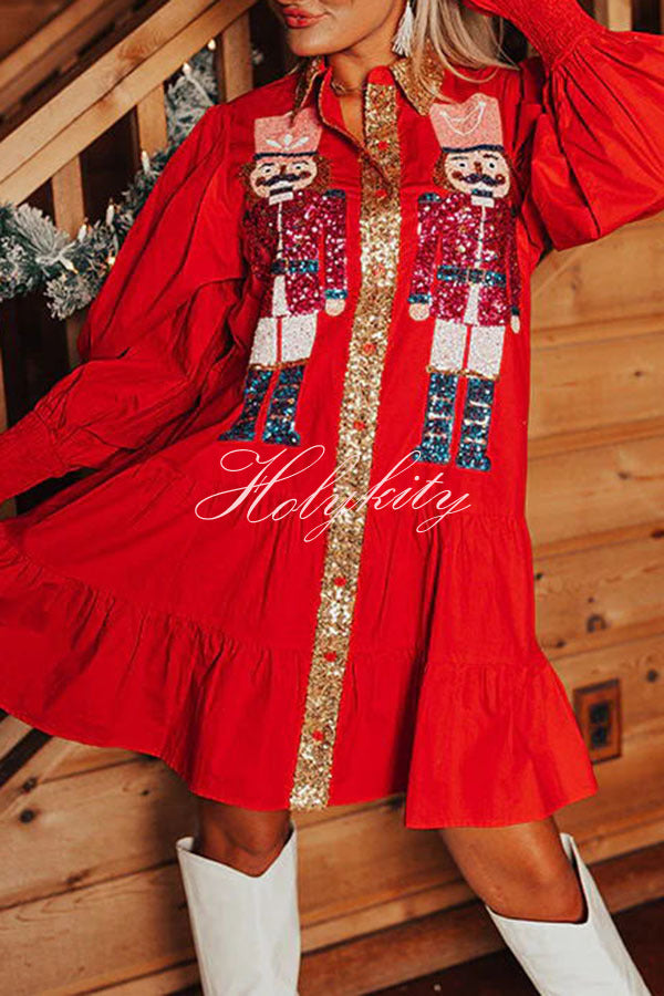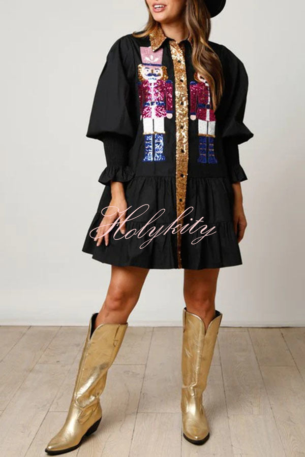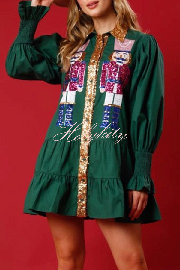 - Visions of sugar-plums dance in your head with this festive dress! A pink, blue, white, and gold colored sequined nutcracker design - A sequined collared neckline that goes into a buttoned front - Long, loose sleeves with smocked ruffle cuffs - Hidden side pockets - A flowy silhouette that ends in a mini dress length hemline.