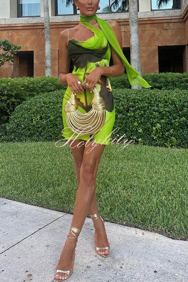 - Taking a 90s-inspired silhouette and elevating it with a scarf that can be draped and tied your way, the Orisha dress is a playful, sexy mini dress. Crafted from a semi-sheer georgette layered over a fluid satin crepe slip, the dress is accented with our signature cowl and barely-there straps. Finished with the dark romance of an oversized floral motif set against a backdrop of fresh and zesty green.