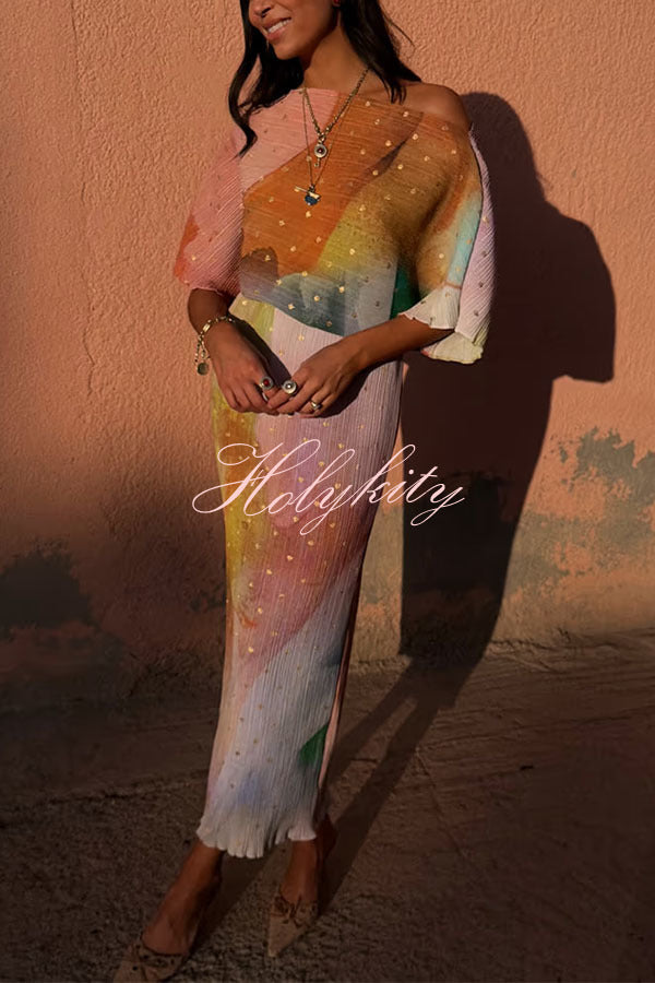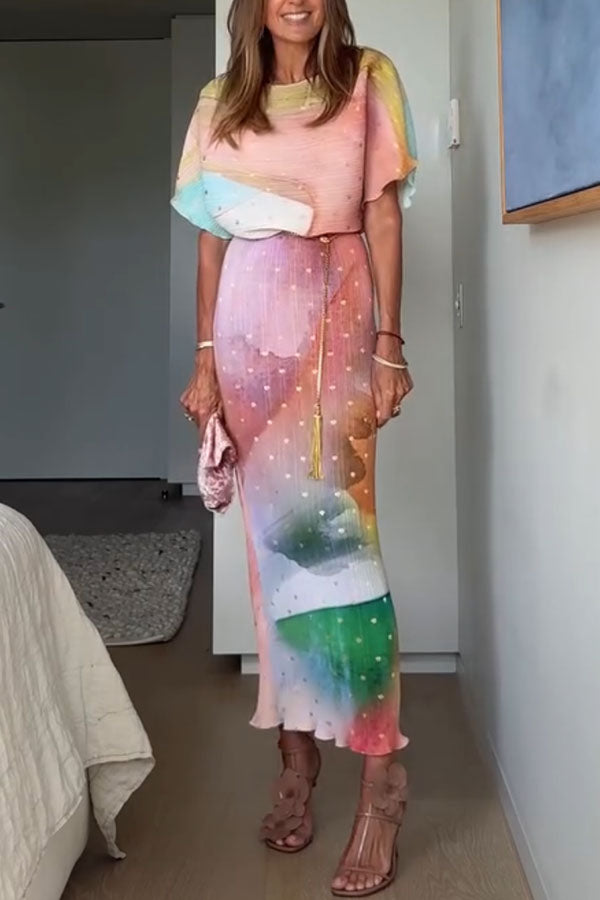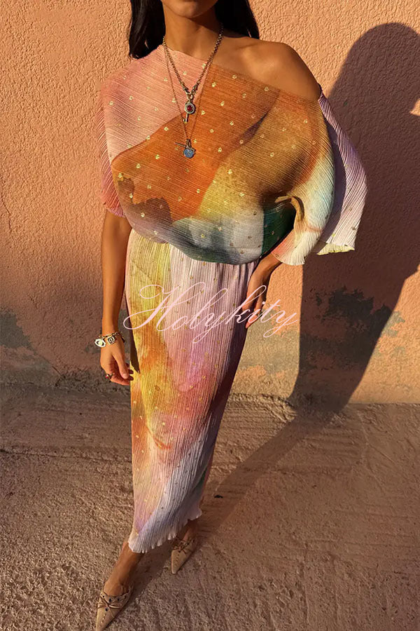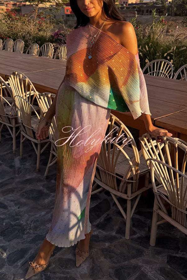 - This bestselling piece, designed in-house, features a metallic print where gold brushstrokes shimmer in the sunlight, creating a chic abstract pattern. The fitted skirt paired with a slightly flared top perfectly accentuates your figure for vacations, parties, or summer weddings.Our distinctive clothing will add instant style to your wardrobe.