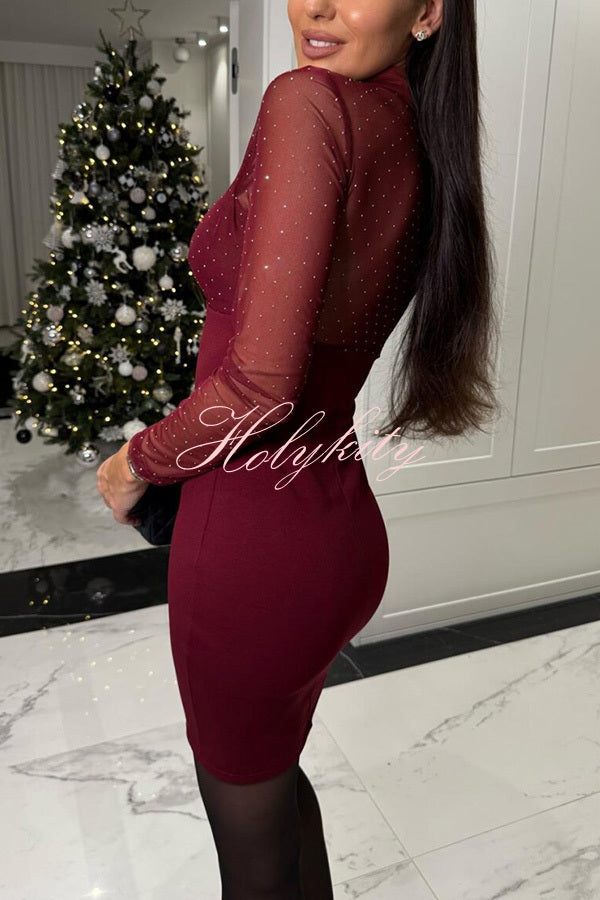 Sexy Energy Mesh Glitter Fabric Cutout Shirt Neck Long Sleeve Stretch Mini Dress
