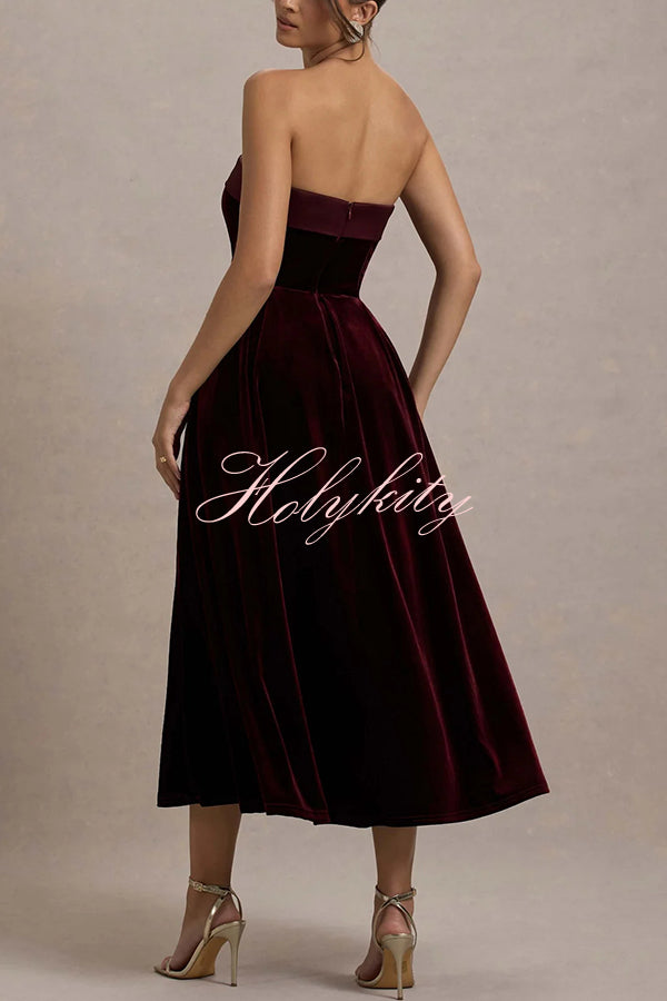 - Known for its rich texture and timeless elegance, this strapless midi dress is a sophisticated choice for your next special occasion. Wrapped in premium port velvet, the fitted silhouette flatters your silhouette. Subtle satin details add a touch of sophistication and enhance the overall look. Minimal accessories and classic heels exude effortless elegance and style, perfect for an evening party or formal dinner.