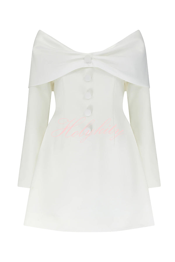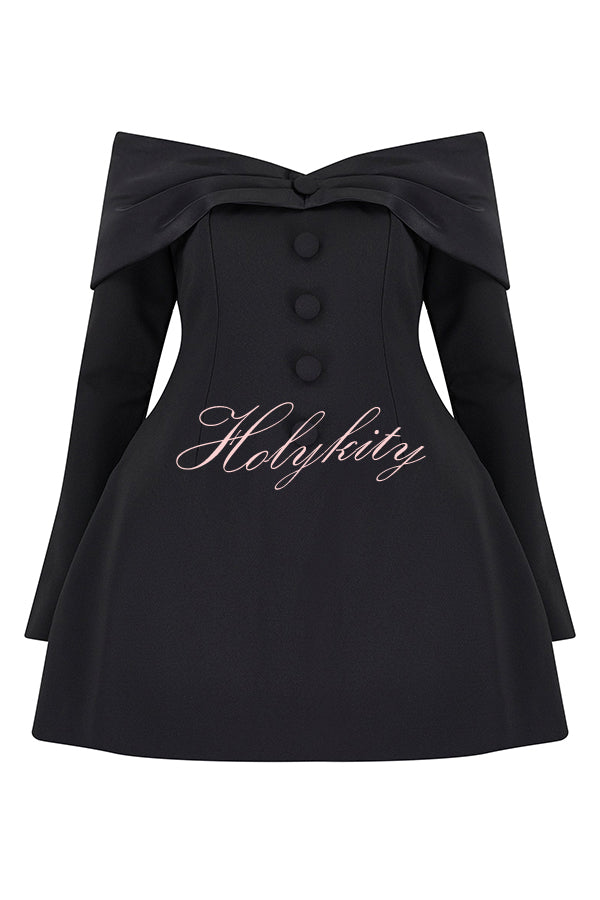 - If elegance was a dress, she would be it. Defined by its sweeping, off-the-shoulder neckline carefully crafted in a satin bow silhouette. Our dedication to bringing our muses the utmost timeless yet statement mini dresses is reinforced, as the satin bow graces the shoulder extending into our signature split sleeves. The subtle contrast of the satin neckline and our signature luxury fabric that embodies the bodice seamlessly blends opulence with delicacy curating a classic touch for the timeless party looks.