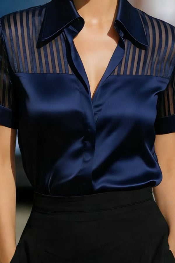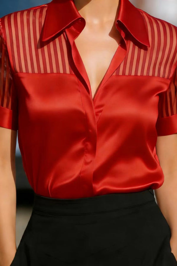 Solid Color Satin Sheer Striped Collared Short-sleeved Casual Shirt