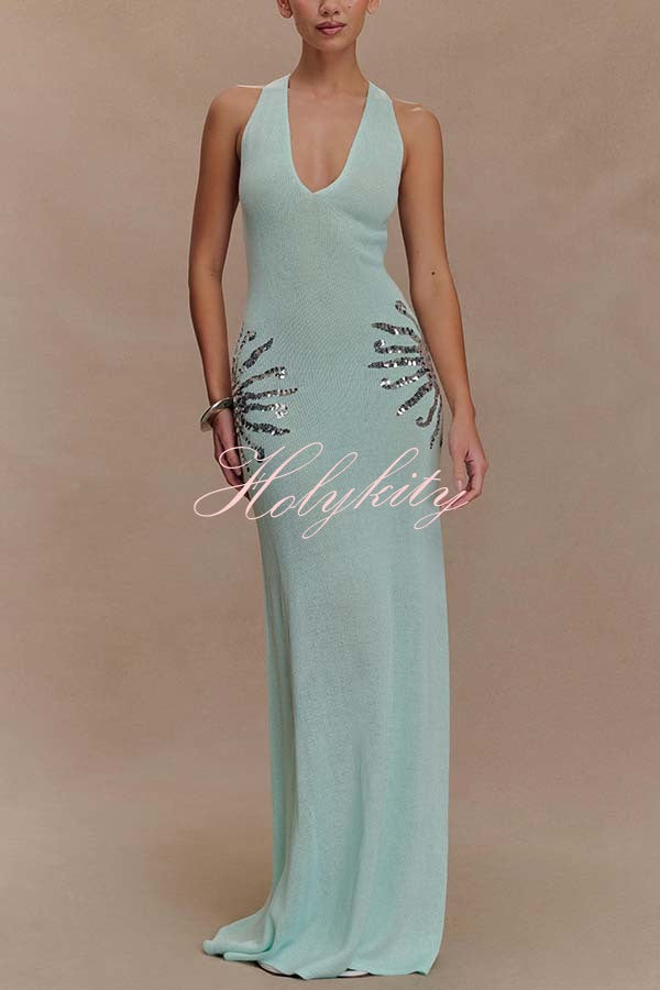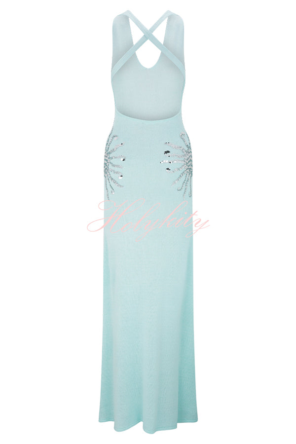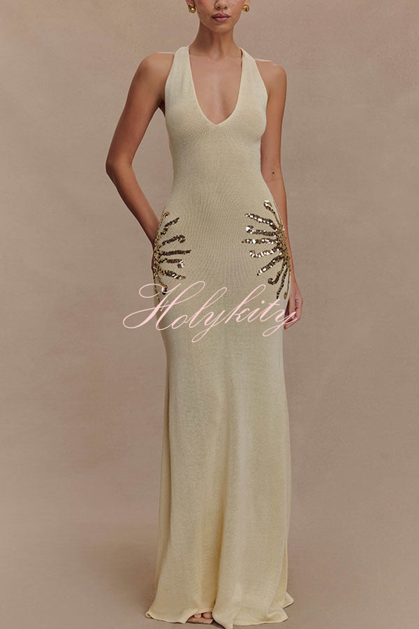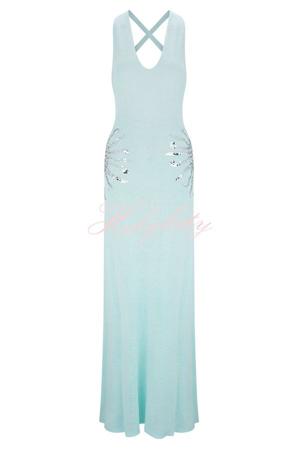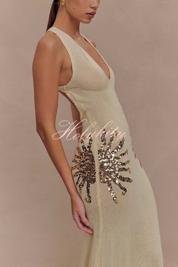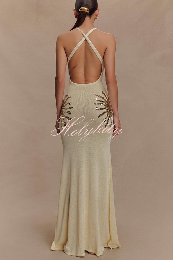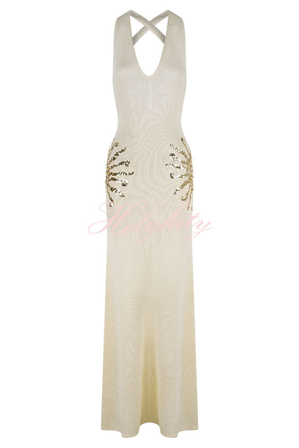- Designed for sunny days and sparkling nights, this sequined knit maxi dress has a relaxed yet shimmering silhouette. Designed with a V-neckline and crisscross back straps, this open-back knit maxi dress is softly unlined and drapes easily over the body. Sunburst sequin detailing at the hip adds a touch of sparkle to this effortlessly elegant piece. Wear it on vacation, for a sunset dinner, or a stroll along the beach.