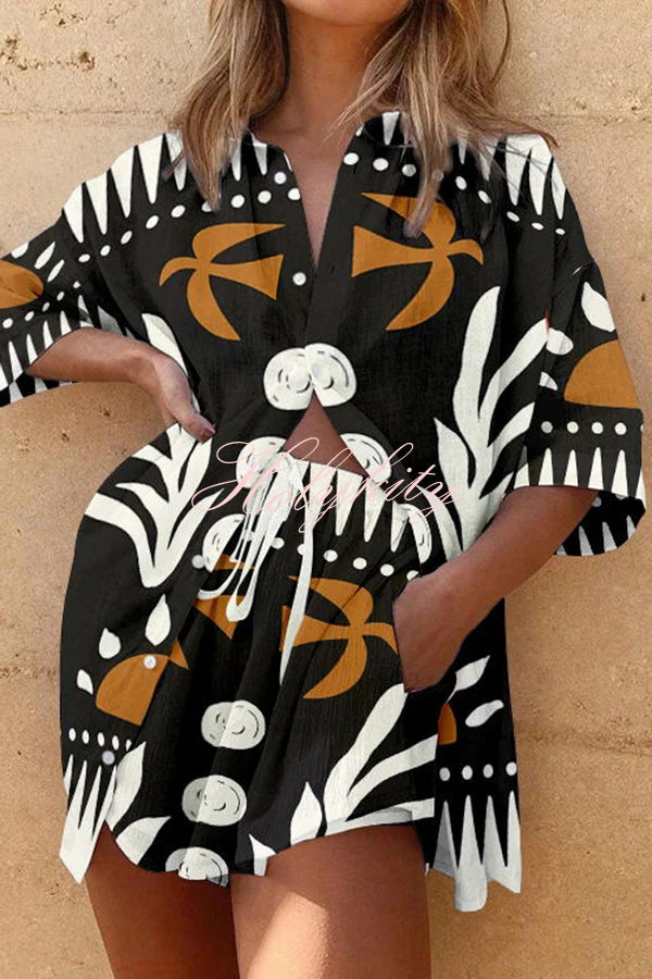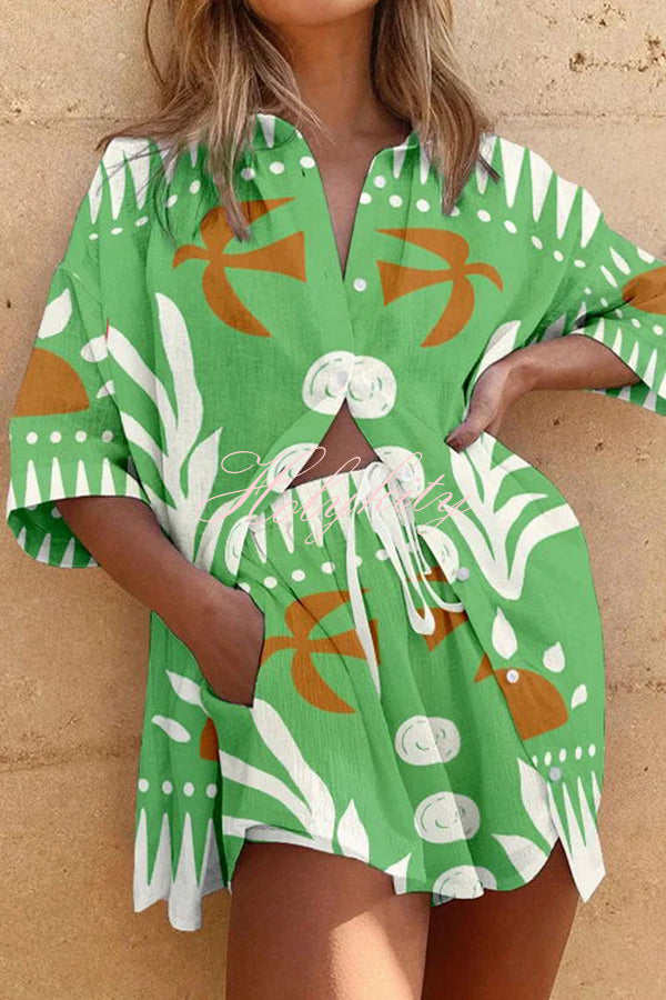 Stylish Exotic Print Button Up Lace Up Shorts Set