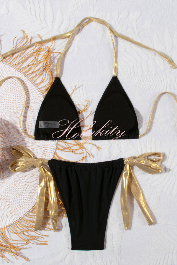 Stylish Halter Neck Gold Tie Stretch Two-piece Bikini Swimsuit